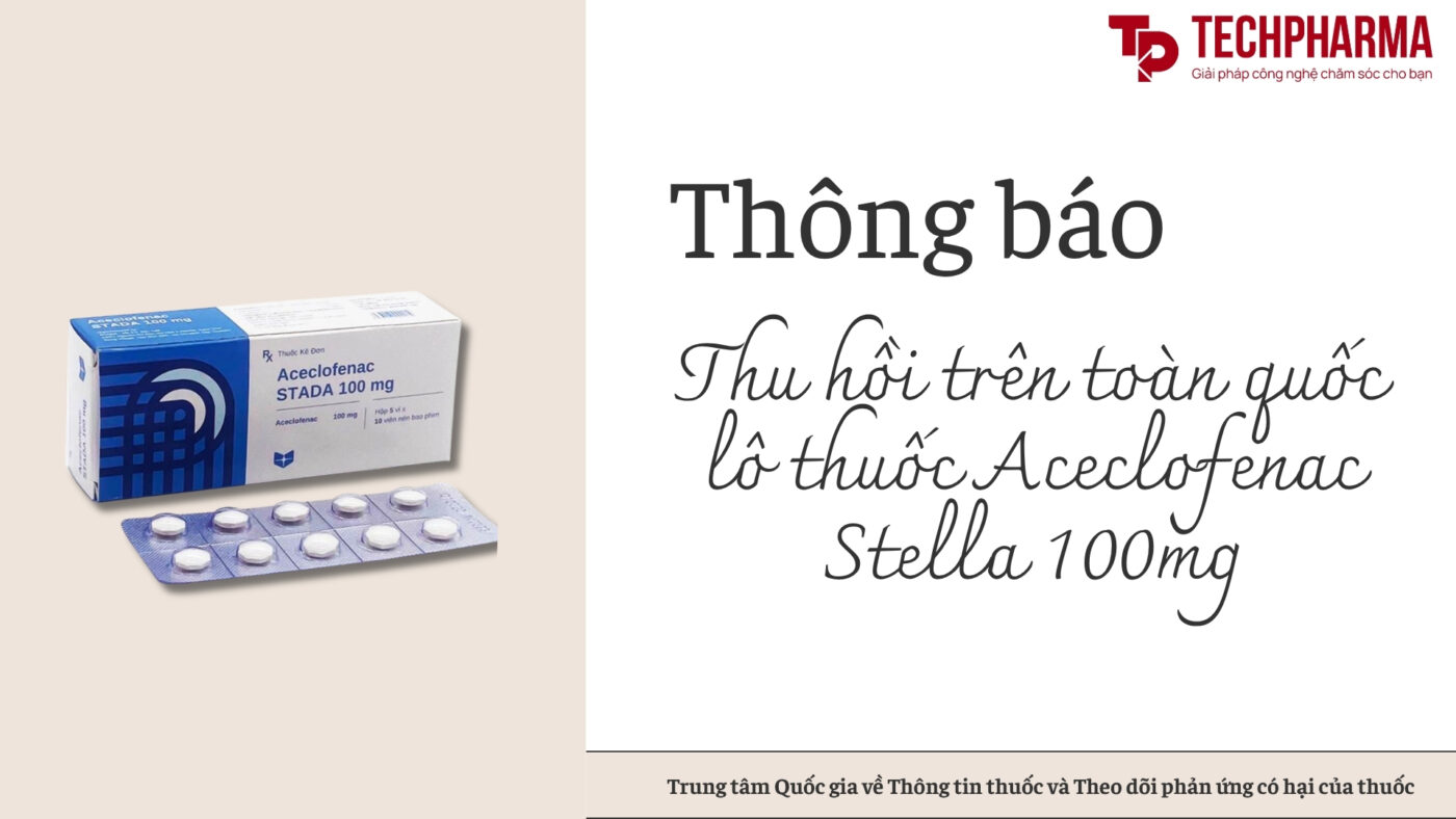Thuốc thu hồi: Viên nén bao phim Aceclofenac STELLA 100mg (Aceclofenac 100mg), Số GĐKLH: VD-20124-13, Số lô: 070423, NSX: 07.04.23, HD: 07.04.26 do Công ty TNHH Liên doanh Stellapharm sản xuất.