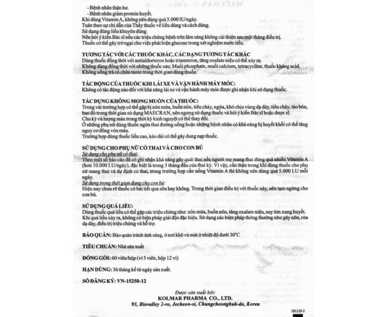 - Trường hợp dùng thuốc Maecran liều cao và kéo dài có thể gây tình trạng dung nạp thuốc.
